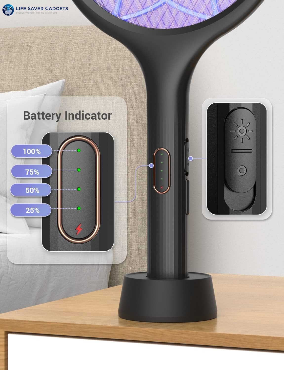 - ( Convenient Auto Zap Mode ) Turn YISSVIC mosquito swatter on, sit it on the storage stand (the charger is not part of the stand). The bug light of electric fly swatter racket will attract the pests and fry them to a crisp