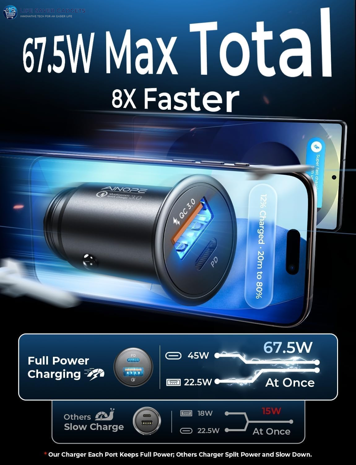 • ππƒπŸ’πŸ“ + 𝟐𝟐.πŸ“ 𝐖𝐀𝐓𝐓 π„π…π…πˆπ‚πˆπ„ππ“ ππ”πˆπ‚πŠ π‚π‡π€π‘π†πˆππ†:Β USB C car charger fast charge supporting PD 45 Watt and QC 22.5 Watt high output, enjoy fast and efficient charging with a maximum output of 67.5. The 45 Watt PD port, 10X faster than 2.4A charger, can fast charge Macbook, iPad, Samsung Galaxy, iPhone 17 16 15 14 Pro Max Plus, Google Pixel and more USB C Devices. The 22.5 Watt Quick Charge 3.0 port, charges devices from 0% to 80% within 35 minutes.