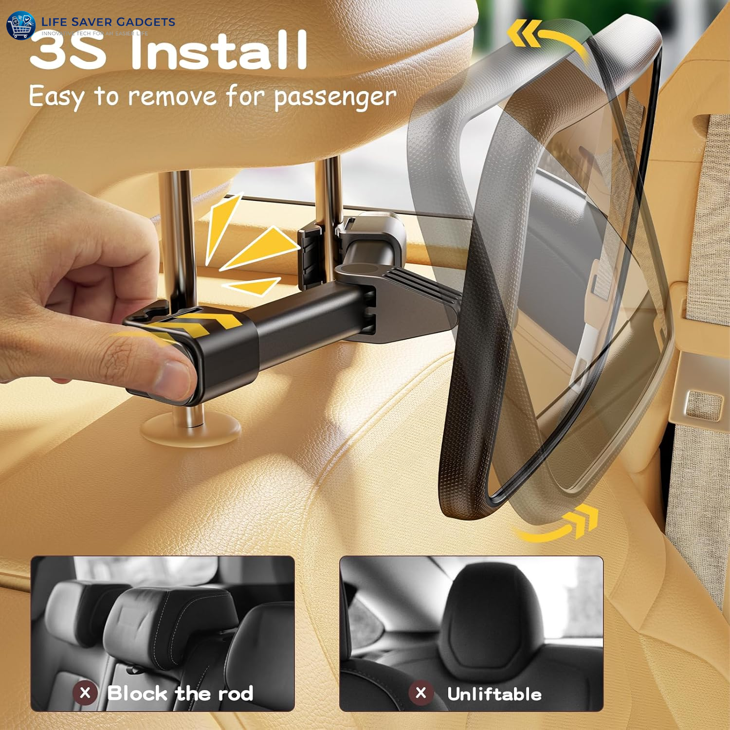- 3S Install: The hook clip design makes the baby mirror for car very easy to install in 3s. Also, you can easily remove this baby car mirror when you have a customer seat in the back row. Just press the hook to lock the headrest's rod. Which can help you get rid of dealing with messy straps. This is a must-have for baby shower gifts