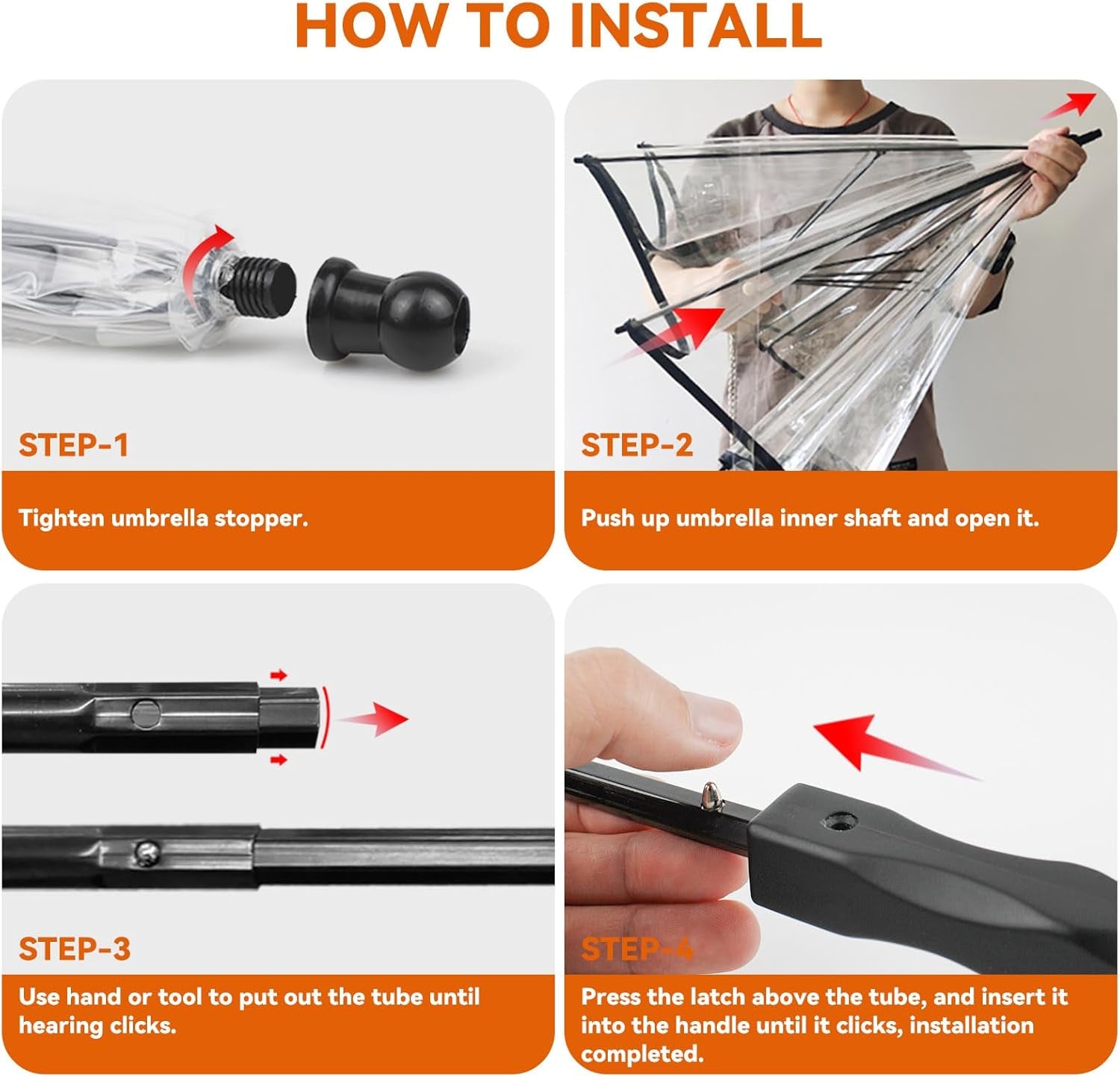 • 3-Step Quick Assembly, Ready to Use: You need to assemble this dog umbrella yourself. Step 1 - Tighten the umbrella stopper. Step 2 - Push up the umbrella inner shaft. Step 3 - Pull out the stretchable tube until hearing clicks. Press latch of the shaft and insert into the handle until it clicks, installation completed